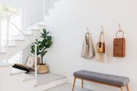 For colder months, opt for a wood entryway coat rack bench to neatly hang your winter jackets before entering the hallway. Need to maximize space in your home? Minimize clutter with a small entryway bench with storage near the front door to stow bags and cold-weather accessories, keeping them out of sight but still within reach.