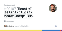ESLint plugin to display errors found by the React compiler.. Latest version: 19.1.0-rc.2, last published: 9 months ago. Start using eslint-plugin-react-compiler in your project by running `npm i eslint-plugin-react-compiler`. There are 107 ...