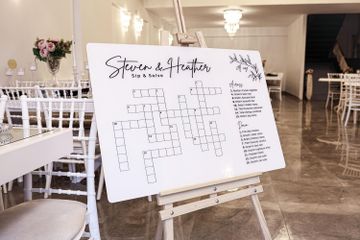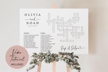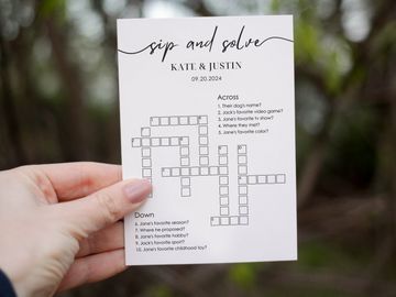 April 9, 2023 - The giant crossword puzzle can be minimalistic, boho, with greenery elements or any customizable item that you desire (as far as they are available). โญWHAT SHOULD I DO?โญ After purchasing, please send me an Etsy private message with the following information: 1. Your font choice for couple's name and for Sip and Solve. 2. Couple's name. 3. Subtitle (eg. wedding date). 4. Up to 40 clues and answers, following the format ANSWER, CLUE (eg.