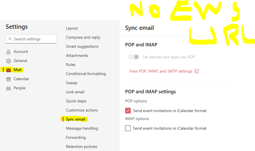 • Navigate to Mail > Sync email. The EWS URL should be listed there.