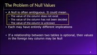 Nulls are negatively viewed from the perspective of database normalization. The idea being that if a value can be nothing, then you really should split that out into another sparse table such that you don't require rows for items which have no value.