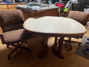 • Slide extension: The table halves slide apart to reveal an insert leaf.