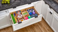 Available in trimmable sizes for deep base drawers, they install easily with just four screws and are great for storing various items, including pots and pans, food storage containers, spices, oils, dishes, and even crafts. Included: (2) drawer front and back rails, (3) long dividers, (2) long notched dividers, (3) small dividers, and mounting hardware.