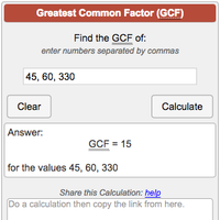 This calculator makes it easy to quickly estimate the least common multiple and greatest comon factor for up to three numbers at a time.