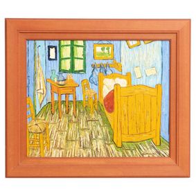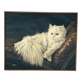 This signed oil painting by Dutch artist Geelong offers a striking reproduction of Vincent van Gogh's famous work "The Bedroom." Painted with remarkable skill, this piece captures th... ... A beautiful, somewhat odd and a little sinister Mid-Century Modern oil on canvas painting featuring a innocent blue eyed boy holding a puppy with a mysterious, almost ominous shadowy...