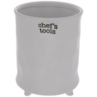 Make sure your cook knows where to find their essentials with accessories like the Chef's Tools Utensil Crock. This ceramic container features a cylindrical shape with a white, dimpled exterior, engraved black lettering, and four white pegs on the bottom that support the body up from the surface ... Make sure your cook knows where to find their essentials with accessories like the Chef's Tools Utensil Crock. This ceramic container features a cylindrical shape with a white, dimpled exterior, engraved black lettering, and four white pegs on the bottom that support the body up from the surface of