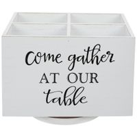 Decorate your kitchen with festive and functional elements like this Gather Rotating Wood Utensil Holder. This MDF piece features a rectangle shape that sits on a spinning base, making it easy to grab what you need. There are four compartments for cutlery, such as knives, forks, spoons, and napkins. It has a white wood-grain finish and the words "Come Gather At Our Table" on the front. Set it on the countertop or dining room table, so your guests have easy access.
