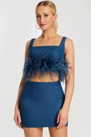 Stand out in this denim two-piece featuring a feather-trimmed crop top and matching mini skirt. A bold, fashion-forward look perfect for nights out.