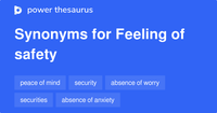 Synonyms for feeling of safety include security, confidence, certainty, comfort, safety, assurance, reassurance, conviction, happiness and sureness. Find more similar words at wordhippo.com!