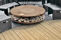 August 22, 2014 - It looks so cool, but I really wouldn't like to have a fixed distance to the fire. When it gets colder I line to move my bench towards the fire. ... This is awesome! ... Just wondering how you plan to keep the cats out, they'll use that sand as a litterbox first chance they get. ... Awesome design! The pit itself is pretty small though.