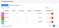 When the monitoring level is set to 1, the Dashboard collects performance (as in response time) and utilization information for every request coming to that endpoint. The following data is recorded: Duration: the duration of processing that request. Time_requested: the timestamp of when the request is being made. Version_requested: the version of the Flask...