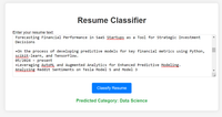 September 16, 2024 - This web app classifies resumes into job categories like “Data Scientist” or “Software Engineer” based on the text content. In future stages of the project, we plan to integrate the LinkedIn API to further automate the resume creation process. This project uses Flask as the backend framework and Scikit-learn to power the machine learning model.