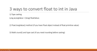 i = (int) Math.ceil(f); f = 2.0 -> i = 2 ; f = 2.22 -> i = 3 ; f = 2.68 -> i = 3 f = -2.0 -> i = -2 ; f = -2.22 -> i = -2 ; f = -2.68 -> i = -2 i = (int) Math.floor(f); f = 2.0 -> i = 2 ; f = 2.22 -> i = 2 ; f = 2.68 -> i = 2 f = -2.0 -> i = -2 ; f = -2.22 -> i = -3 ; f = -2.68 -> i = -3