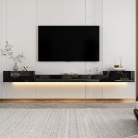 Eye catching and elegant, using a floating shelf for tv components opens up the space below the TV for other things, or nothing, making the space easy to clean. ... Kuno 60"W Floating TV Stand Wall Mounted with LED Lights, TV Cabinet, Modern High Gloss Media Console