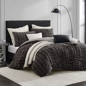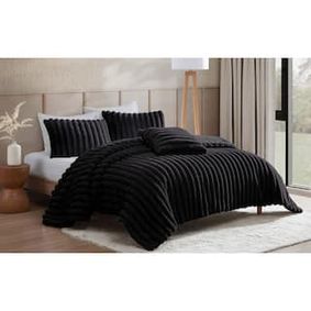 Add glamor and style to your home with the Logan Black Faux Fur Comforter Set - Queen. Made from super soft, ridged black faux fur that reverses to smooth black faux fur, the comforter provides supreme warmth and comfort. This rustic bedding includes a comforter and two coordinating shams. · Long poly faux fur with solid poly faux mink reverse and brushed fiber fill · Includes one 90"W x 90"L comforter and two 20"W x 26"L standard shams with 2" flange · Machine wash cold, gentle cycle and separately; Tumble dry low; Use large capacity appliances
