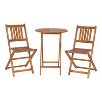 Revolutionize the look of your patio, deck, sunroom, or breakfast nook with this 3 piece folding bistro set. This table and 2 chair set is ideal for smaller spaces or to create an intimate conversation spot in larger areas. Compact and convenient, this 3 piece set can be folded to take with you on vacation or stored away during winter months. Made from naturally weather-resistant acacia wood, supported by a strong, but lightweight, X-shaped frame, and given a slatted design that assists with air flow and drying, this patio set will give you long-lasting seating indoors or out. The table suppor