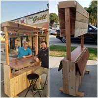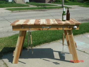 The ones at Costco, they’re just bomb proof. If you want to something semi fancy, I have found adjustable legs to be invaluable; I have the REI camping table. It’s finicky, and have had to adjust the leg clamps, but works great. I don’t have a good photo, but here’s one with the little Trager on it (~65 lbs). No messing around with balancing the thing, just put it wherever you want and adjust the legs to the ground. It’s one of those things I can’t believe I lived without out. Hopefully they improve the design, or others offer the same.