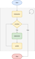 for loops consist of three parts, any of which may also be empty; one (the first) is executed before the first iteration, and one (the third) at the end of each iteration. These parts usually initialize and increment a counter, respectively; but they may do anything.