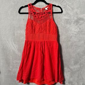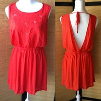 This Vibrant Red Sleeveless Dress by Forever 21 features a pretty front crochet pattern and an open back tie design. subtle yet sexy ;) elastic shirring at waist. Skirt with lining. In excellent condition without any signs of wear