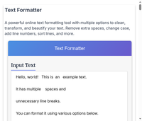 A text formatter is an online tool that helps clean, organize, and transform text. It can remove extra spaces, change text case, add line numbers, sort lines, and perform various other text formatting operations to make your text cleaner and more consistent.