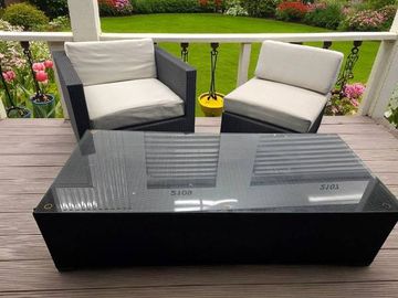 Premium Outdoor patio furniture - three piece curved. Plus table ... WHITE COMPOSITE DECK CHAIRS...FREE.