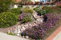This hardscaping idea makes all of the difference when you are trying to transform your front yard. This is the first thing people see when they visit your home, we make it something they remember! ... This front yard features a seating area and jar fountain, ringed by aromatic native plantings of California Lilac, Manzanita, Cleveland Sage. A meadow-style planting of native sedge grasses create soft look in the foreground, and new concrete pavers add a modern touch.