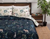 Frolic from bed in natural comfort and style with our Bambi Comforter Set. This cozy comforter set features a kid-friendly design of wild flora, fauna, and deer on a midnight blue ground, and flips over to a coordinating design over an off-white reverse for front-to-back style. Made with an wonderfully soft bamboo cotton blend surface, this comforter is also filled with eco-friendly recycled polyester fiber