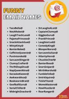 Funny email names include InboxNinja, LOLMailer, Spamurai, ChucklePost, and MemeMessenger to add humor to your ID.