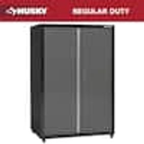 Refine your storage space with the Husky ready-to-assemble freestanding garage cabinet. Built with durable weather-resistant 24-gauge steel, it ensures long-lasting use. Perfect for your workshop, mudroom or basement, it features three adjustable shelves and pegboards for hanging tools and equipment. Designed for organization and efficiency, this cabinet helps keep your space neat and functional.