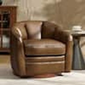 Create the perfect reading nook with this cozy swivel barrel chair wrapped in buttery genuine leather. Its rounded frame is made from kiln-dried wood with a soft, wraparound silhouette. The foam and synthetic fiber cushion, supported by web suspension and springs, offers a comfy feel. Also perfect for a home office. Comfortable chairs. And the right color. Not too dark and not too yellow. Big enough for my husband to enjoy and small enough to fit two chairs into my living room area.