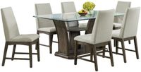 The Elements International Dapper Grey/Glass Rectangle Dining Table features a beautiful glass table top and an intricate wooden base. With 6 upholstered side chairs this dining set is a beautiful addition to any home.