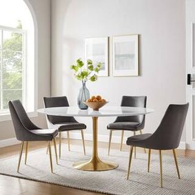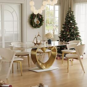 To introduce a modern flair, consider glass dining tables that reflect light and create a sense of openness. Our glass dining tables feature clear or gray glass that is 5/8 inches thick with flat polished edges. For timeless elegance, think marble dining tables paired with gold dining room chairs.