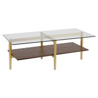 AGV 202206 Tadio Glass Coffee Table, Double Layer Glass Coffee Table for Living Space, Gold Finish Frmae, Ultra-Clear Glass & Walnut Wood Top