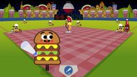 I personally love the art style and the picnic theme. The field is a picnic mat, the batters are all food and drinks, and the American flag fireworks when you get a homer.
