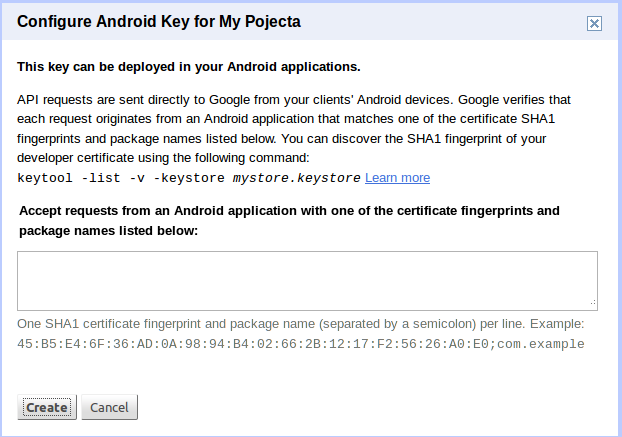 Click on create new key. Add the fingerprint along with your android project package name.