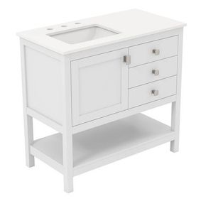This freestanding single vanity combines an open silhouette with plenty of storage – keeping your bathroom looking + feeling its best. The cabinet features two soft-close doors and two drawers with corrugated fronts for everything from makeup and cleaning supplies and hair dryers and other toiletries, while an open lower shelf provides easy access to frequently used items. It’s topped by a thick white granite countertop with an integrated resin sink.