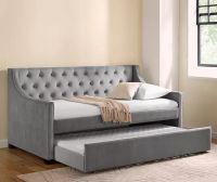 This upholstered daybed with a roll-out trundle brings elegant seating and an extra sleeping surface to any room. The curved sides, button tufted backrest and trundle frame are covered in a neutral gray fabric as nailhead trim lines the arms. It's a wonderful addition to a child's or guest room.