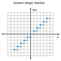 July 14, 2025 - For example: @$\begin{align*}⌊3.7⌋ = 3\end{align*}@$ @$\begin{align*}⌊-2.3⌋ = -3\end{align*}@$ @$\begin{align*}⌊6⌋ = 6 \end{align*}@$ i The graph of the greatest integer function is a series of steps. For any integer @$\begin{align*}x\end{align*}@$, the function value is equal to ...