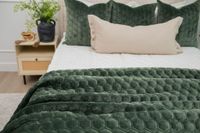 The Remington blanket features an emerald honeycomb quilted velvet on one side and a matching buff gray velvet on the other. This green blanket is specifically crafted to bring comfort and elegance to your bedroom and will be your haven for relaxation and warmth. Unlike anything we've done before, the Remington blanket is bound to bring a cozy touch to any space.