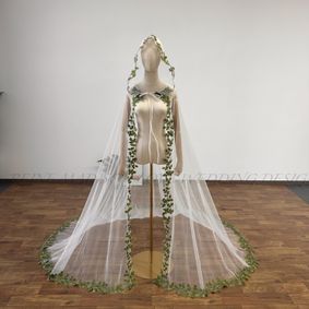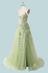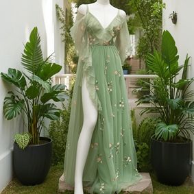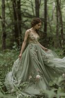 October 18, 2024 - This enchanting wedding gown is perfect for a bride seeking a nature-inspired, whimsical look. The dress features a soft green hue with delicate floral patterns, making it ideal for outdoor, garden, or bohemian-style weddings. The bodice has a plunging V neckline with thin straps, adding a touch of modernity, while the full, flowing skirt creates a romantic and ethereal effect.