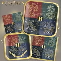 Featuring an assortment of Hogwarts themed supplies and magical themed symbols from the world of Harry Potter, this collection will have your guests casting spells and playing quidditch at your child’s next birthday party. This complete set of invitations, tableware, decor, favors and accessories coordinate to make set up easy and feature the classic Hogwarts house colors of red, green, yellow and blue, the house mascots and Harry Potter icons in a dreamy, watercolor art style.