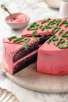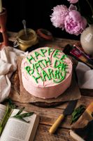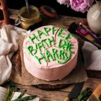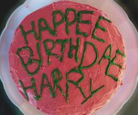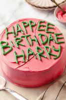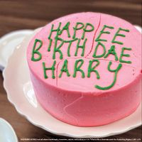 To contrast, the movie cake has the iconic pink frosting with green lettering, but is misspelled as "Happee Birthdae Harry."