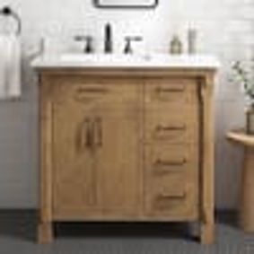 The best-rated product in Bathroom Vanities with Tops is the Alistair 36B in. W x 22 in. D x 33.9 in. H Vanity in Oak with White Stone Vanity Top with White Basin no Side Cabinet.