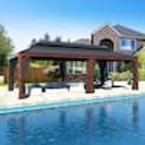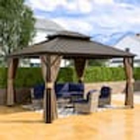 One of our best-selling patio gazebos is the 15 ft. x 13 ft. Wood Grain Aluminum Double Galvanized Steel Roof Gazebo with Ceiling Hook, Mosquito Netting and Curtains.