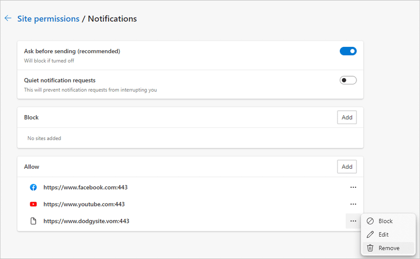 For any entries you don't recognize in the Allow section, click the ellipsis (3 dots) to the right of each entry and either Block or Remove it.
