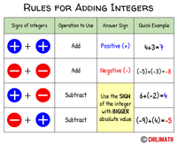 Different Signs - Subtract the smaller absolute value from the larger absolute value and give the answer the same sign as the number with the larger absolute value · Subtracting Integers - Same as adding the opposite of that integer number. A general example to help you recognize patterns ...