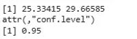 # Calculate the mean and standard error l.model <- lm(mpg ~ 1, mtcars) # Calculate the confidence interval confint(l.model, level=0.95) ## 2.5 % 97.5 % ## (Intercept) 17.91768 22.26357 · Use R to complete the following activities (this is just for practice you do not need to turn anything in).