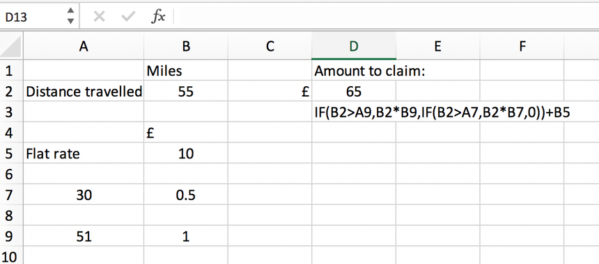 where column D is just descriptive. I put the £10.00 flat fee in Cell E1.