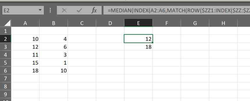 =MEDIAN(INDEX(A2:A6,MATCH(ROW($ZZ1:INDEX($ZZ:$ZZ,SUM(B2:B6)))-1,SUMIF(OFFSET(B1,0,,ROW(B2:B6)-MIN(ROW(B2:B6))+1,),"<>"))))